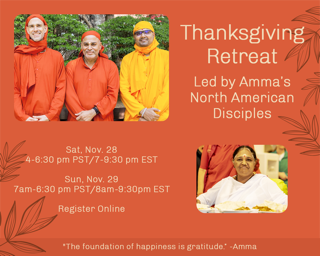 This online spiritual retreat, led by Swami Dayamritananda Puri, Swami Shantamritananda Puri and Br. Ramanandamrita Chaitanya, provides time to reflect on cultivating Gratitude even during difficult times. It is a wonderful opportunity to learn how to deepen our inner connection with Amma, especially when we are not able to be in her physical presence.