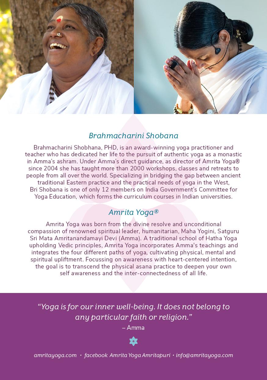 Bramacharini Shobana, PhD, is an award winning yoga practitioner and teacher who has dedicated her life to the pursuit of authentic yoga as a monastic in Amma’s ashram. As director of Amrita Yoga, since 2004 she has taught more than 2000 workshops, classes and retreats to people from all over the world.