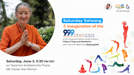 You can register at ihhc20.org/999 to receive the instructions to then continue the 9 day challenge on your own. You can also kickoff the challenge on June 10th at 4:30 PM with a group practice session of the 9 Surya Namaskars and Peace Meditation led by Swamini. This session can be attended in person at the MA Center San Ramon or virtually.  We will have a 2nd group practice session on Saturday June 17th at 4:30 PM to mark Day 8 of the challenge.