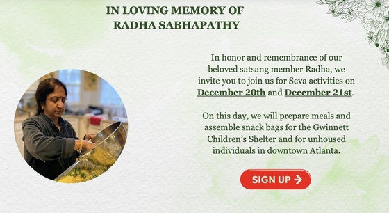 In honor and remembrance of our beloved satsang member Radha, we invite you to join us for Seva activities on December 20th and December 21st.