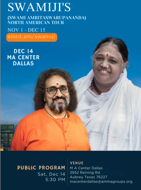 We are pleased to invite you to a public program led by Swami Amritaswarupananda Puri, Amma’s most senior disciple at MA Center Dallas on Saturday, December 14, starting at 5:30 PM.