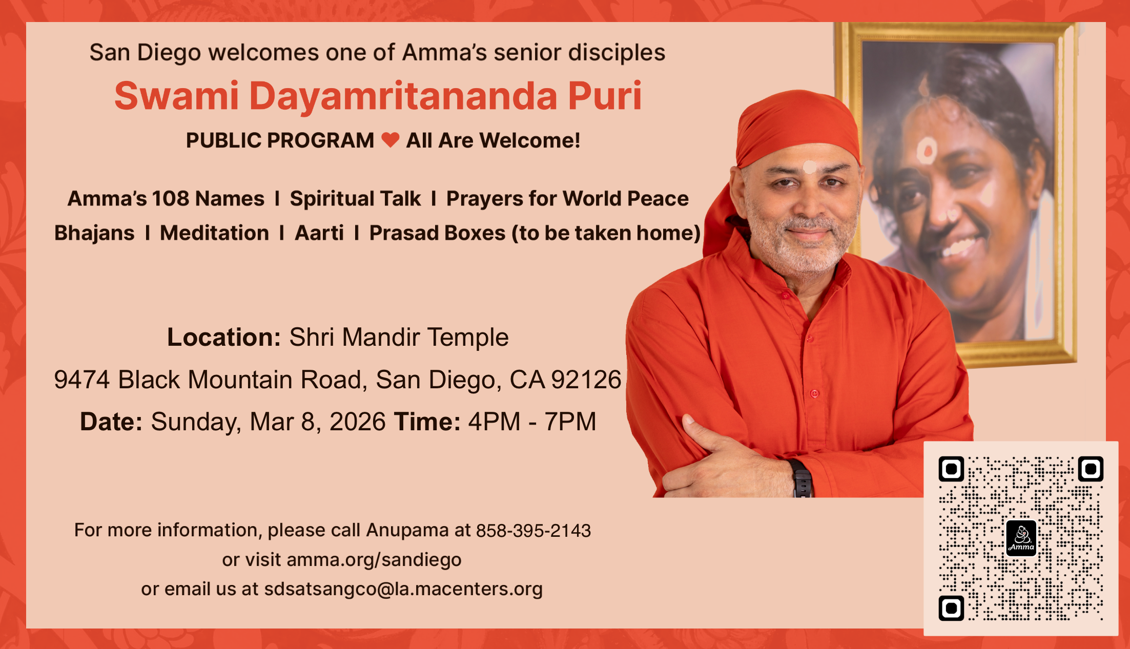 in person Satsang with Sw. Dayamritananda Puri @ Shri Mandir, San Diego
