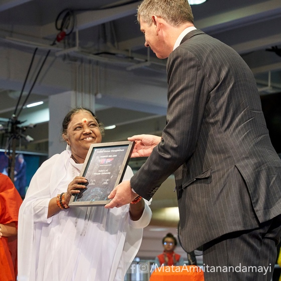 Award of Times Higher Education to Chancellor Amma, as Amrita University was ranked the #1 Private University in India. Chief Data Officer Mr. Duncan Ross said that what he most appreciated about Amrita University is that it takes learning and knowledge out to communities around the world - "Because it’s not enough for universities just to excel. They need to be part of society. They need to reach out to the peoples across the world. In these times where we see walls being put up, they need to be truly global, in giving us hope for the future of humanity."