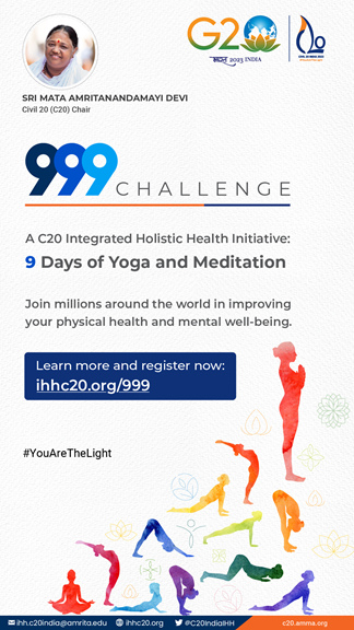 The C20 Integrated Holistic Health Working Group’s 999 challenge aims to highlight how yoga and meditation can have a major impact on mental health and physical well being. Participants of the challenge have reported experiencing positive changes in their outlook, energy levels and overall sense of well-being. This, in turn, contributes to an atmosphere of peace.
